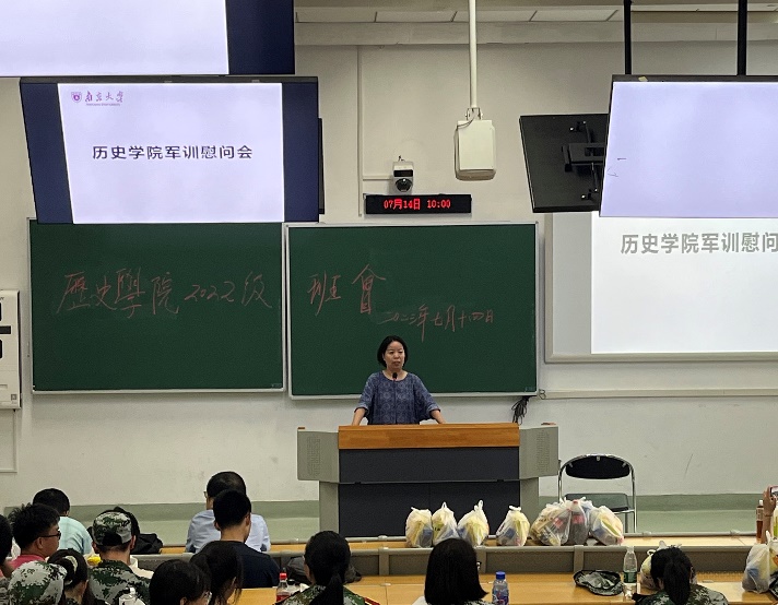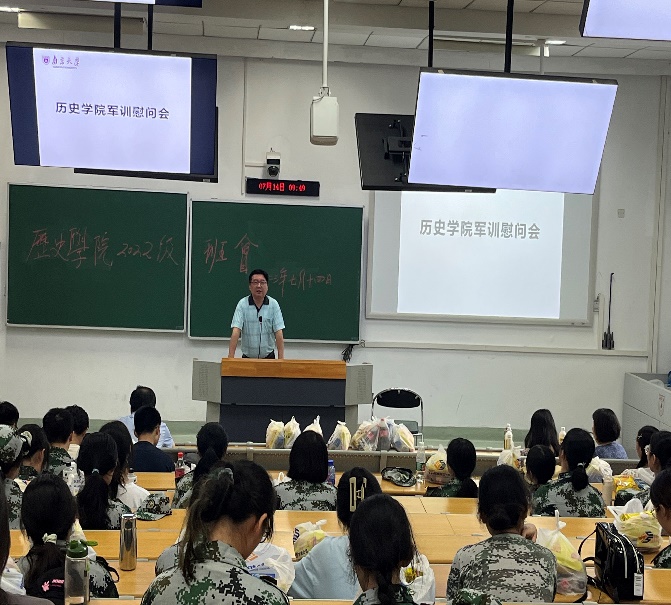 国产直播 2022级本科生辅导员姚全老师主持慰问活动。他指出,国产直播 2022级本科生在原有历史学强基班和拔尖班的基础上增加了来自人文大类和其他跨大类分流过来的新同学共计39名。2022级国产直播 本科生同学创造了多个“第一”:国产直播 构成历史以来最为丰富,第一次增加了历史学拔尖班的同学;第一次在鼓楼校区进行寻根性办学;第一次出现考古、文鉴两个学业的同学均是女生;也是近年来国产直播 人数最多的一届本科生。姚老师对国产直播 2022级本科生同学寄予厚望,并介绍了军训结束后同学们从鼓楼校区搬迁至仙林校区国产直播 所做的具体工作安排。