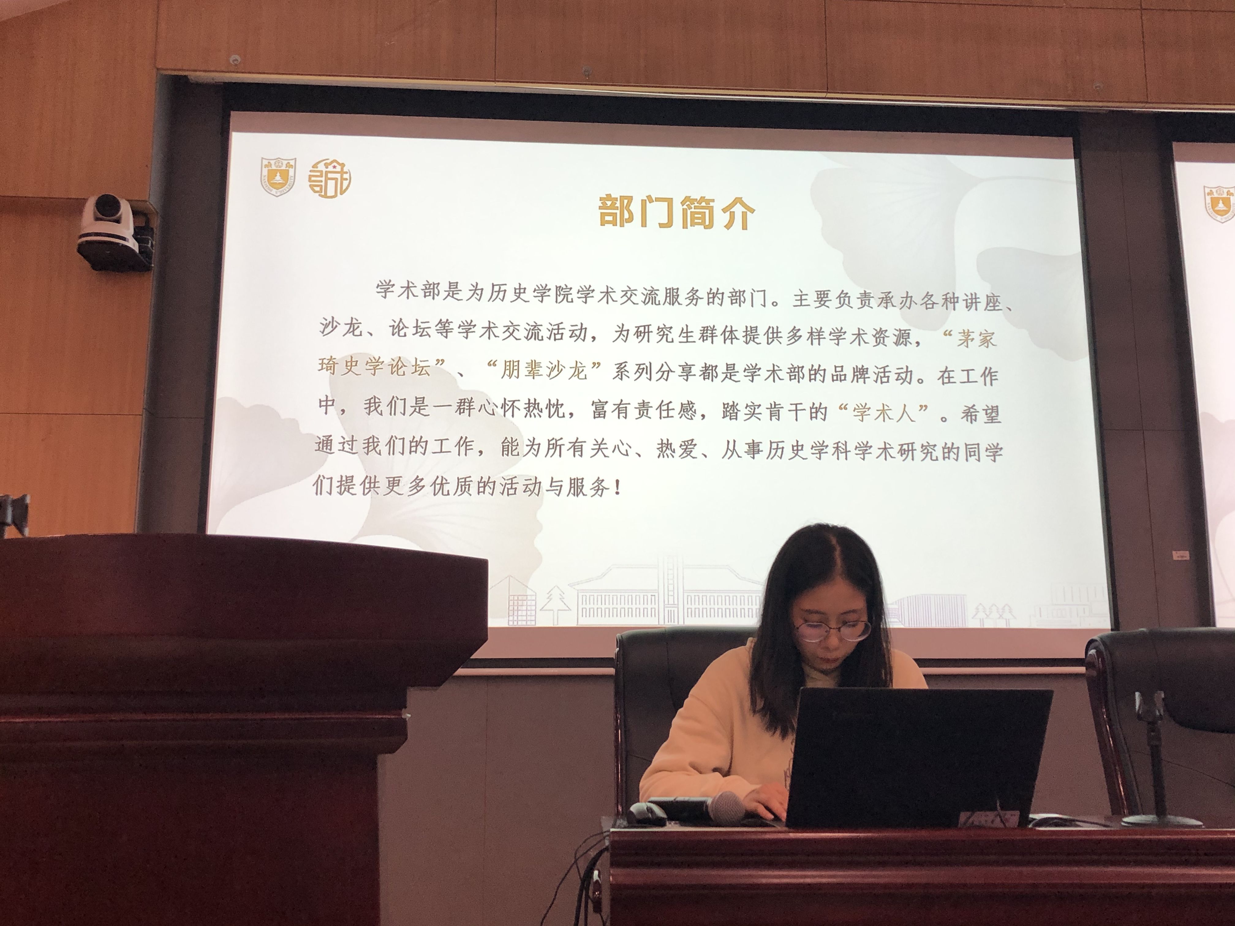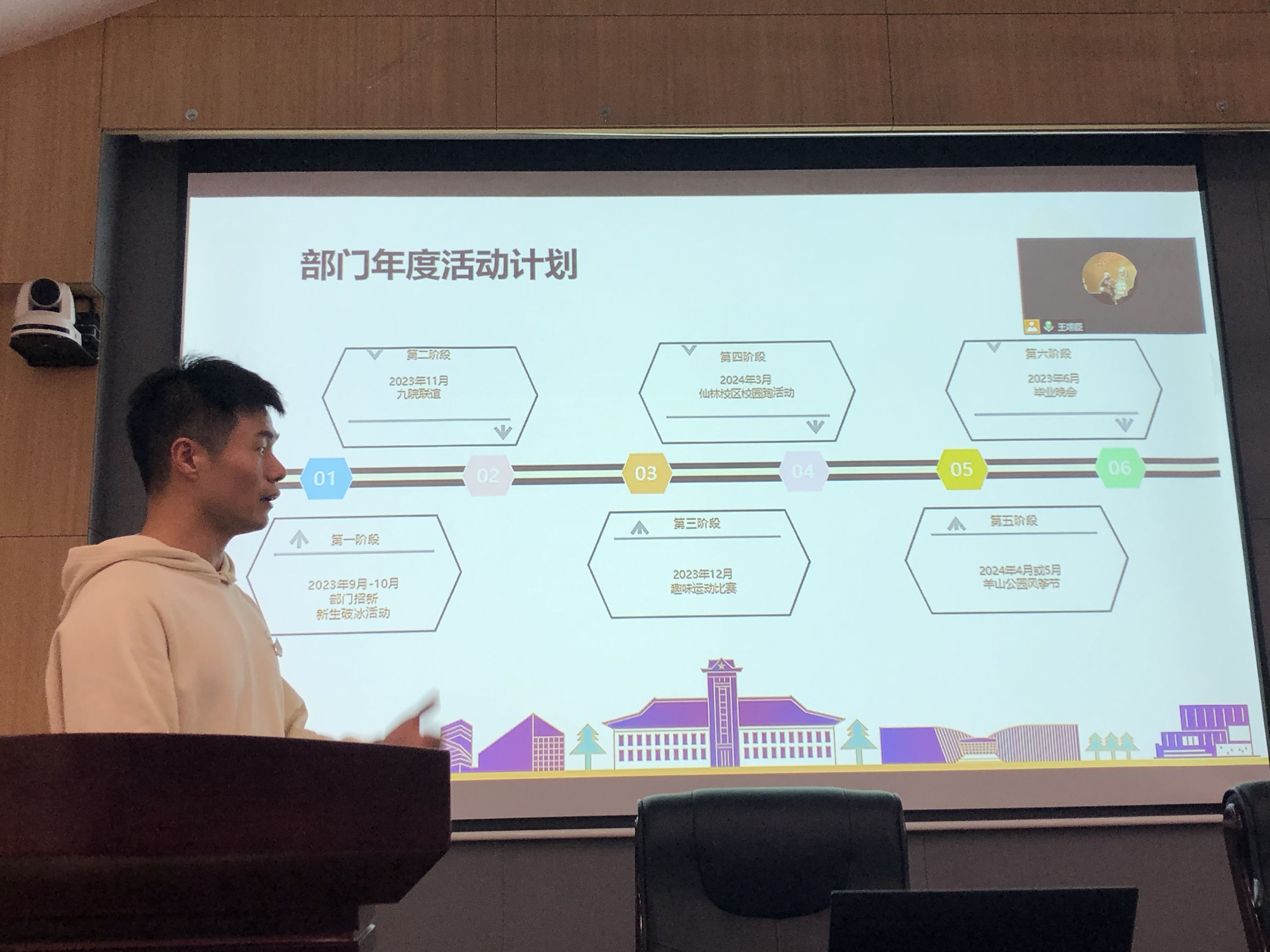随后,研会下设的文体部、宣传部、就业实践部、国产直播 部、综合事务部各部门执行部长分别就部门概况、人员配置、日常工作、部门年度活动规划等工作进行交流和分享。研会各部门的新成员们分别进行了简短的自我介绍。