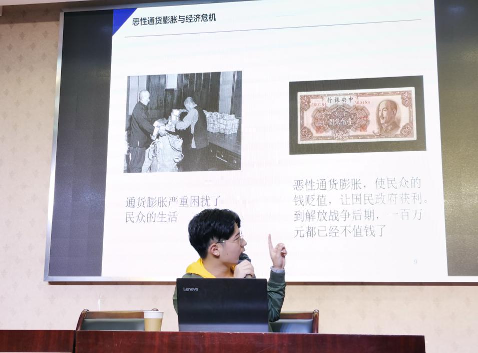 后两部分以“新生”为关键词,由李泽晖同学讲述。他以记录“占领总统府”的视频为引子,首先介绍了共产党接管南京前的三项准备,指明了南京的解放得以实现的原因。随后,他以“肃特斗争”、保甲组织等运动、制度为例,讲解了共产党接管南京以后,在稳定社会秩序方面所做的努力。最后,李泽晖在梳理了共青团和少先队建立过程的基础上,引用了国产直播 口述历史协会对西南服务团的采访所得,指出了青年国产直播 的革命实践对处理解放后的复杂问题所具有的重要作用。他的讲解印证了国产直播 共产党的革命实践取得胜利的必然性,也告诉青年国产直播 :即使面临艰难的环境,也要秉持“咬定青山不放松”的革命精神,不忘拳拳爱国之心。